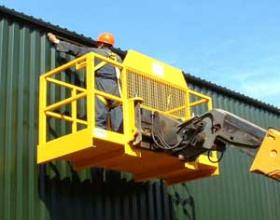 Robust fork mounted work platform, for safe overhead working. Standard features include Non slip floor, Harness rail, fork securing device and lift bar gate.